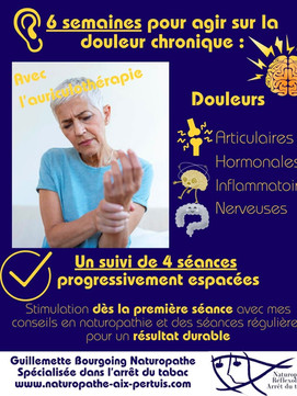 Nous nous retrouvons 4 fois à mon cabinet de Villelaure pour des séances de réflexologie auriculaire ciblées sur la gestion de la douleur et l’équilibre du système nerveux.